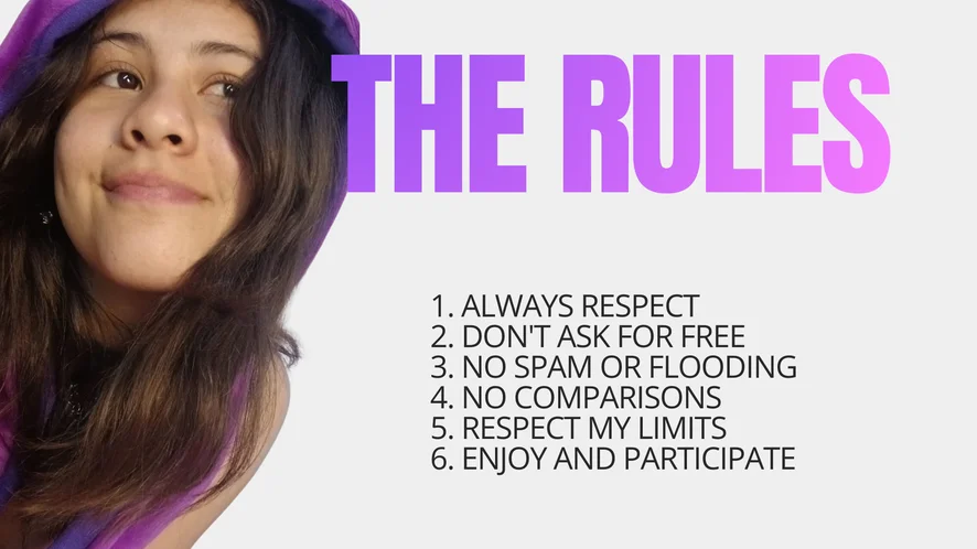 🌸 MY ROOM RULES 🌸 1. Always respect No insults, spam or harsh comments. If you want to be here, be nice to me and everyone. 2. Don't ask for free Everything you want is in the tip menu or the roulette wheel. If you want it... earn it! 😘 3. No spam or flooding Write beautifully and calmly. I like to read them all without chaos in the chat. 4. No comparisons Don't compare my body, my style or my vibes with other models. Here you are with me, so enjoy me 💛. 5. Respect my limits Don't insist if I say I don't do something. Keep the cute, gamer and rich vibe without crossing the line. 6. Enjoy and participate I love it when you play, type, use roulette or follow my dynamics! Make me feel it and the energy will be better for both of us 😈✨